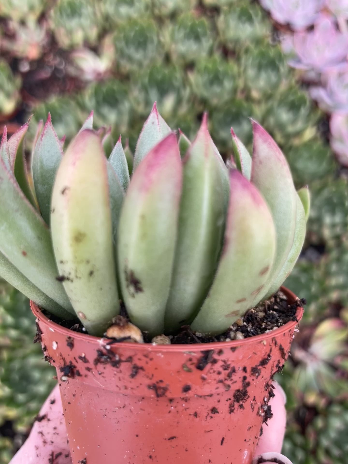 Care: All succulents need their roots to completely dry out in between waterings, which ties into their low-maintenance behavior. Display in bright sun for 6-8 hours in the morning. Pull dry leaves off bottom of your succulent to deter pests. Plant in your favorite pot (drainage hole recommended) in well-draining soil.