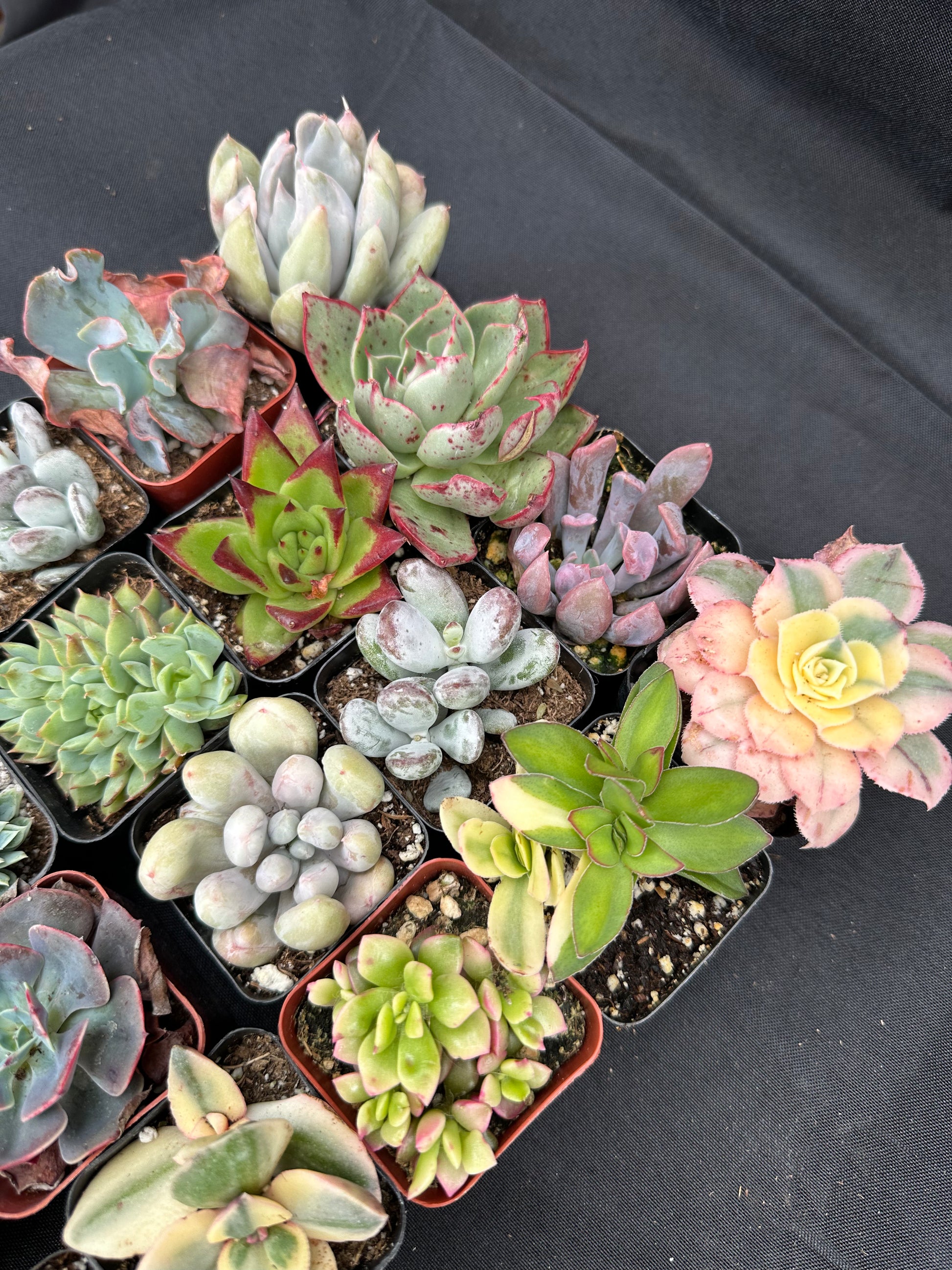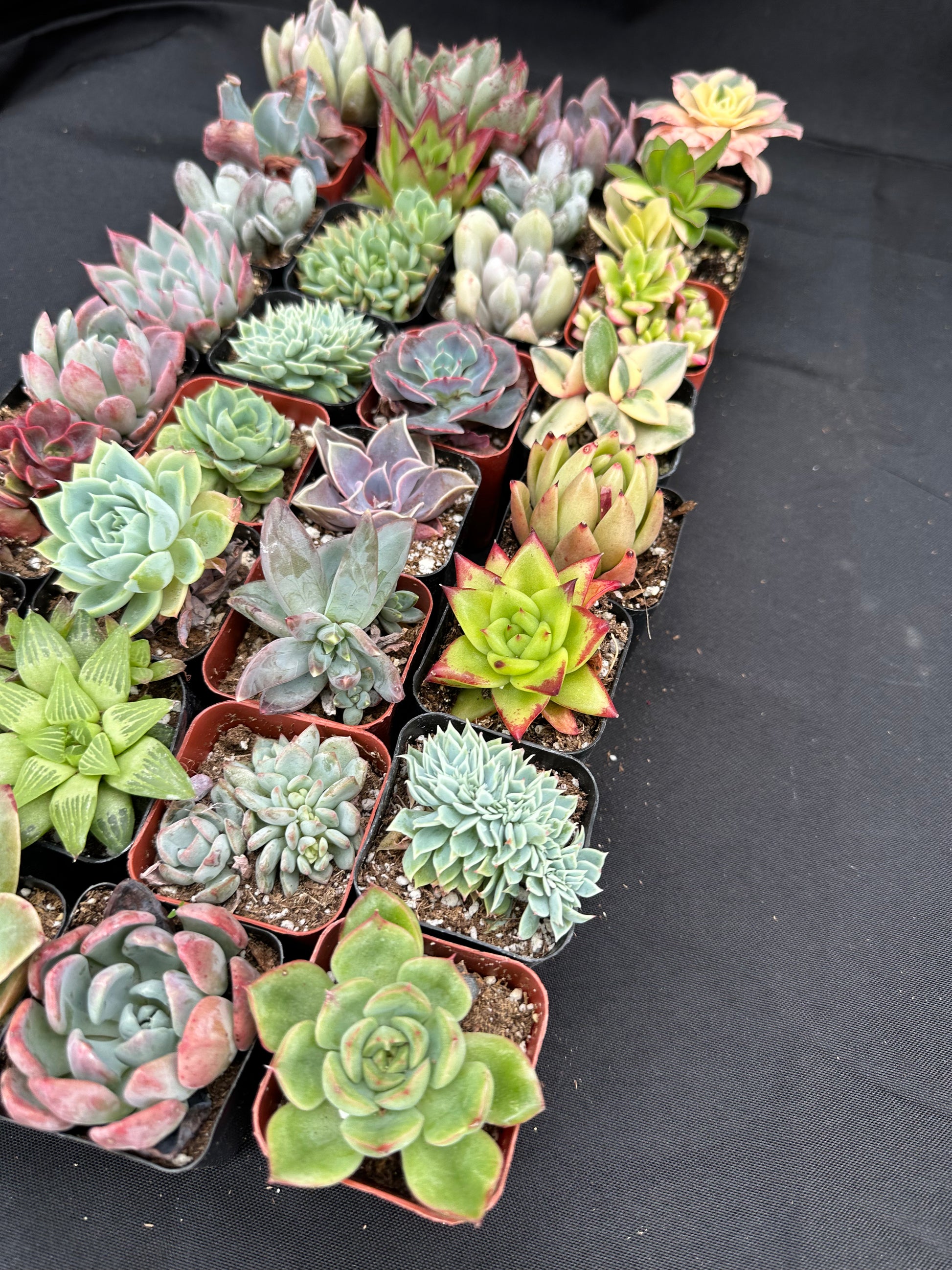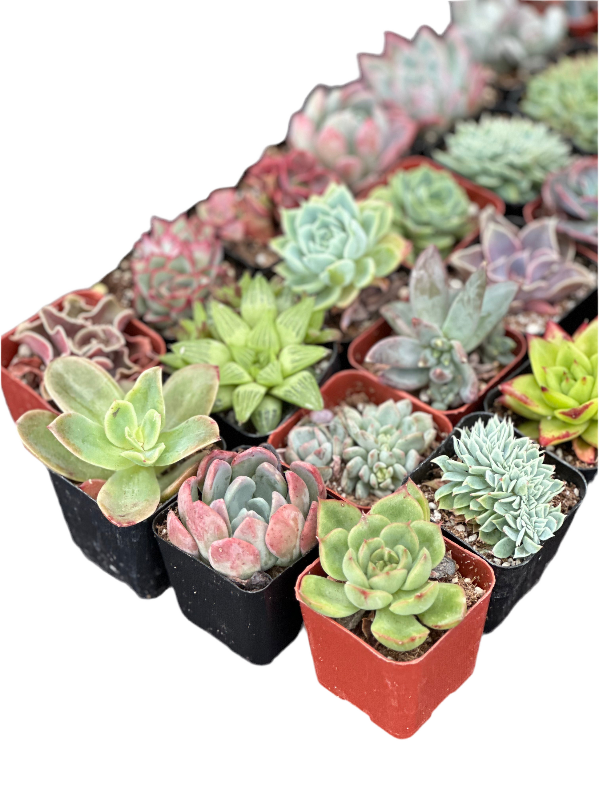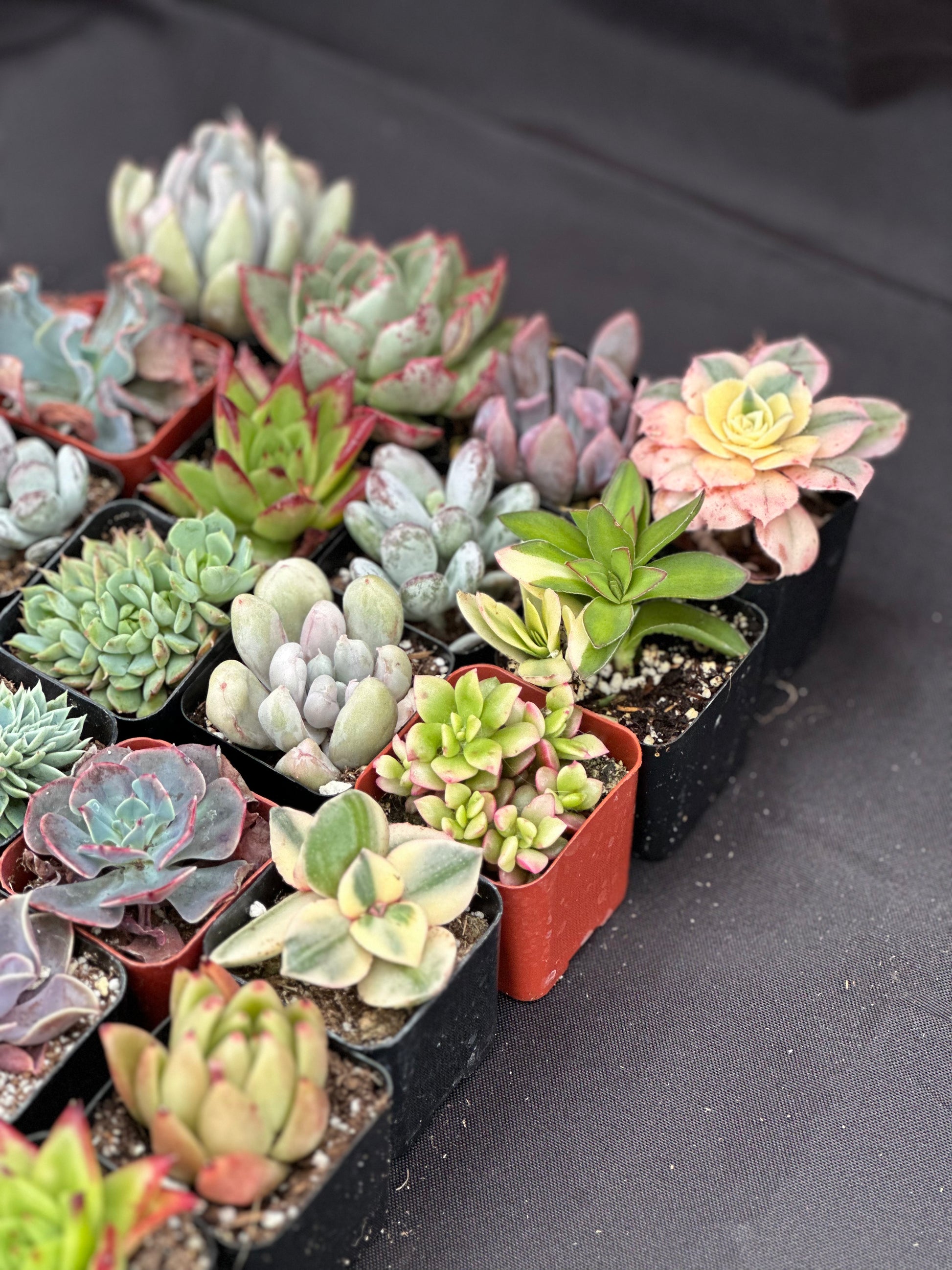A beautiful assortment of vibrant 🌈 colors, varieties & textures to brighten up your garden, container garden and/or your special event. Each order of a rainbow half-flat contains 32 plants grown in a 2" pot, all shipped bare root. Pictures shown are examples of what you‘ll get. I personally hand pick each and every succulent once your order is placed so there's always an element of surprise & excitement. I can’t guarantee specific varieties but I do guarantee a beautiful array of color, variety & texture and can fulfill preference you may have for a dominant color of purple, light blue, minty green, etc.