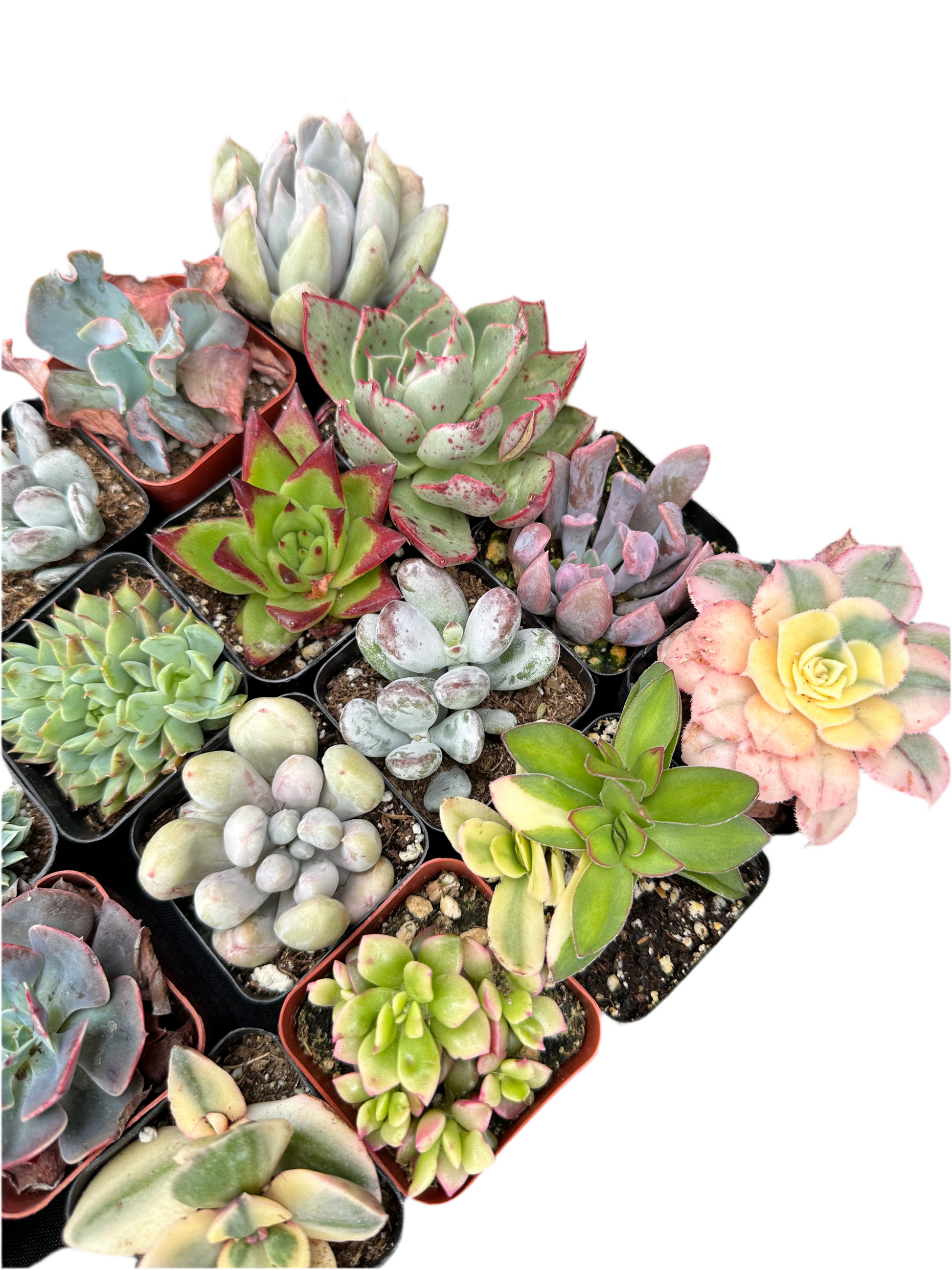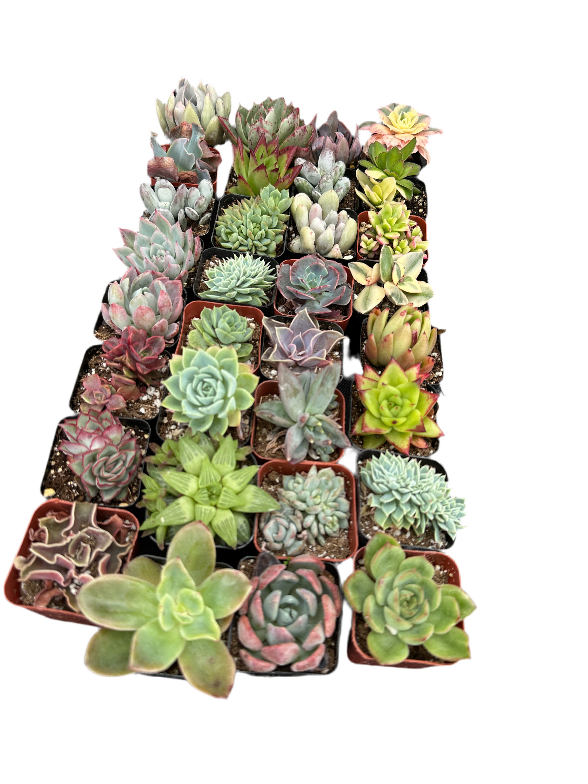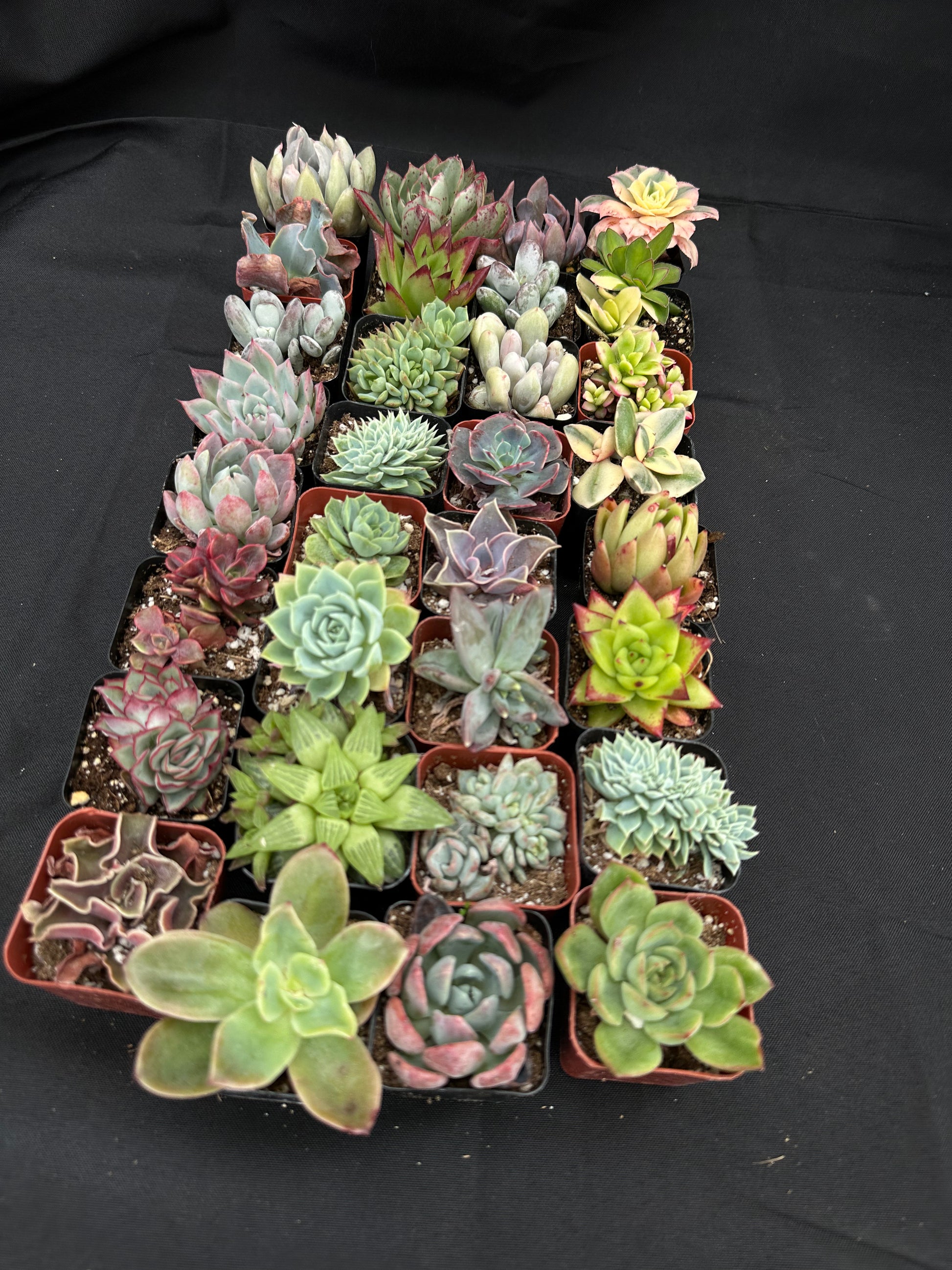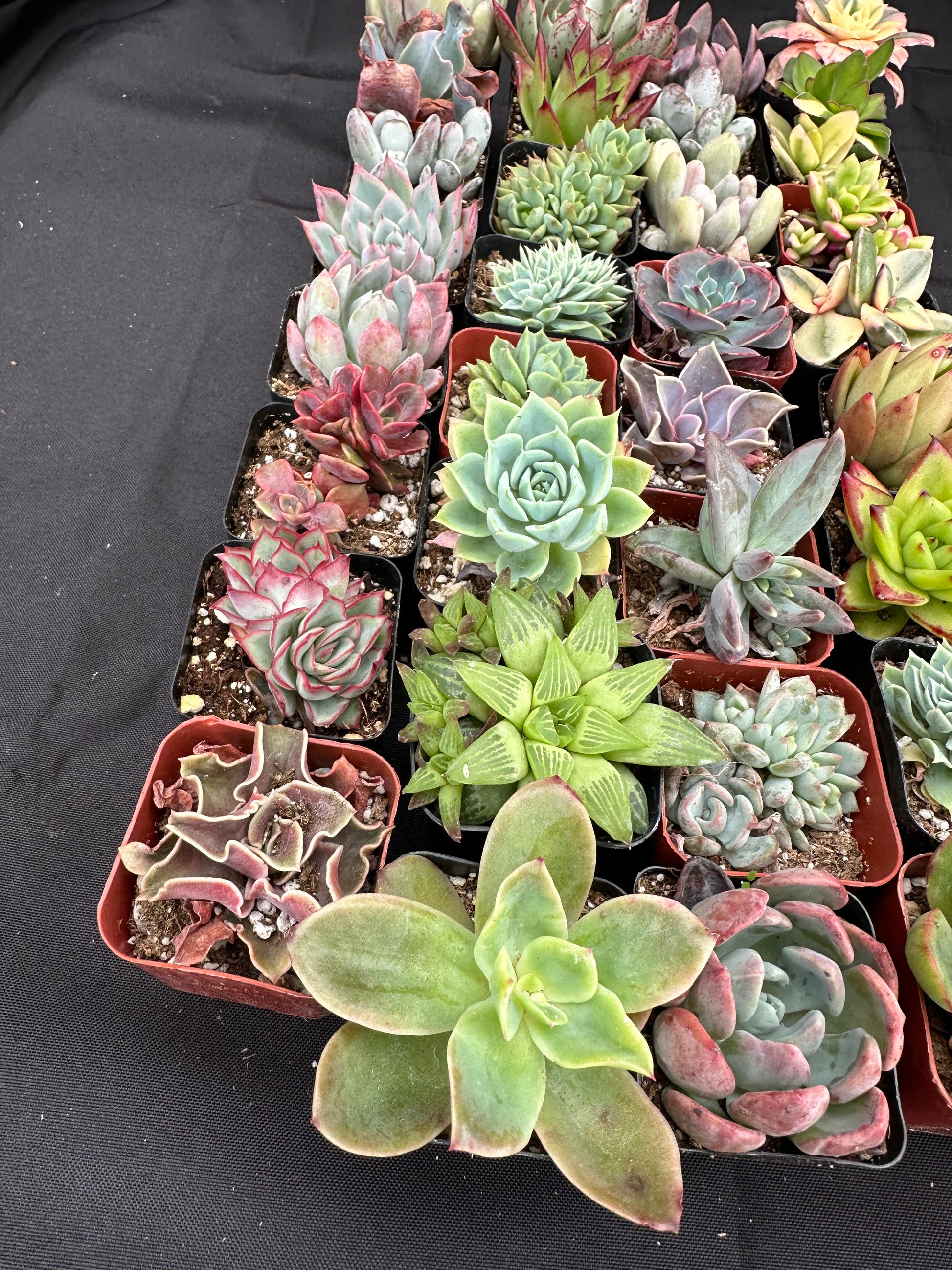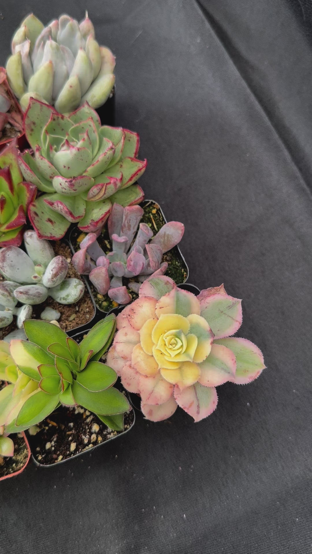 A beautiful assortment of vibrant 🌈 colors, varieties & textures to brighten up your garden, container garden and/or your special event. Each order of a rainbow half-flat contains 32 plants grown in a 2" pot, all shipped bare root. Pictures shown are examples of what you‘ll get. I personally hand pick each and every succulent once your order is placed so there's always an element of surprise & excitement. I can’t guarantee specific varieties but I do guarantee a beautiful array of color, variety & texture and can fulfill preference you may have for a dominant color of purple, light blue, minty green, etc.