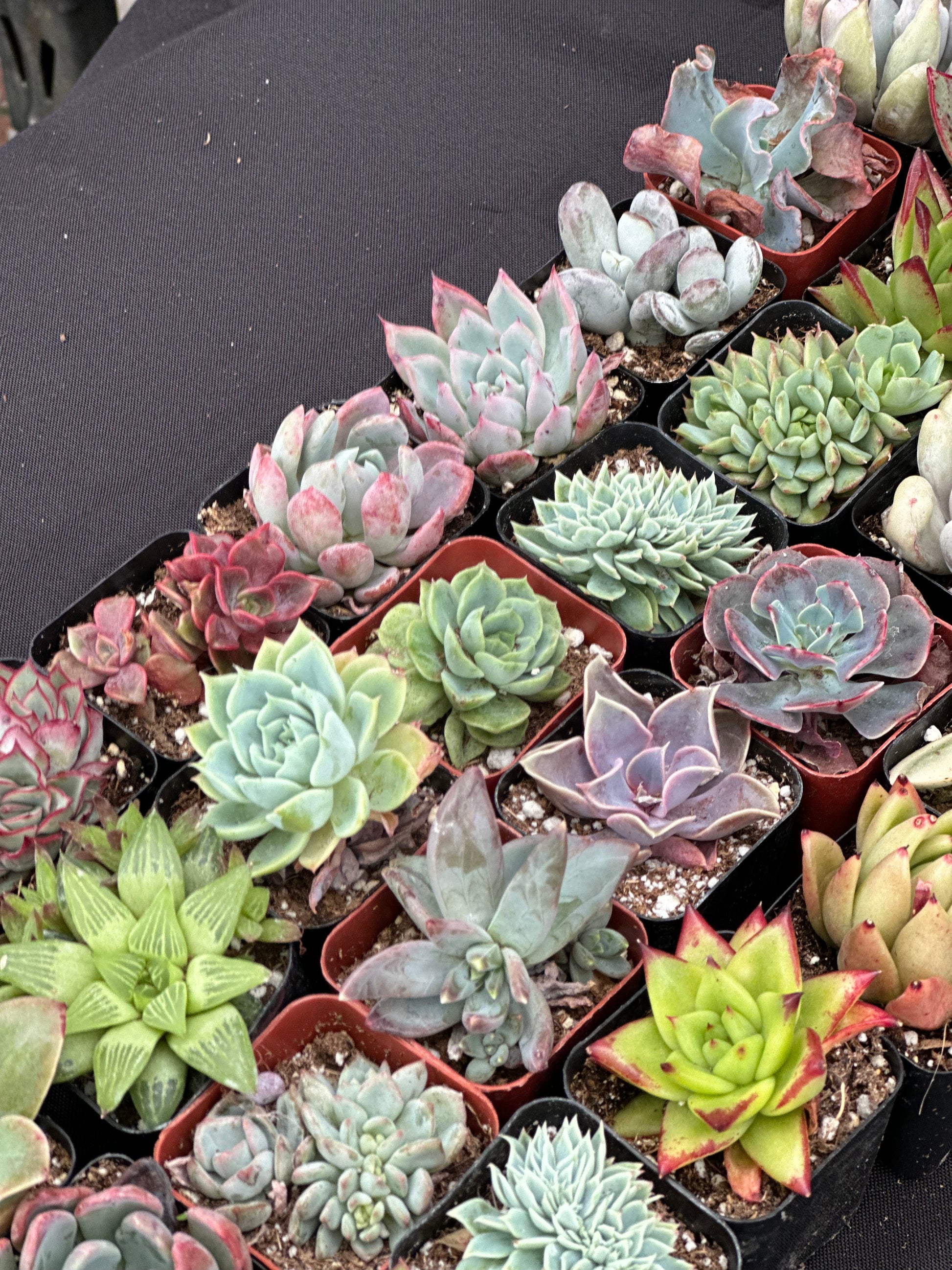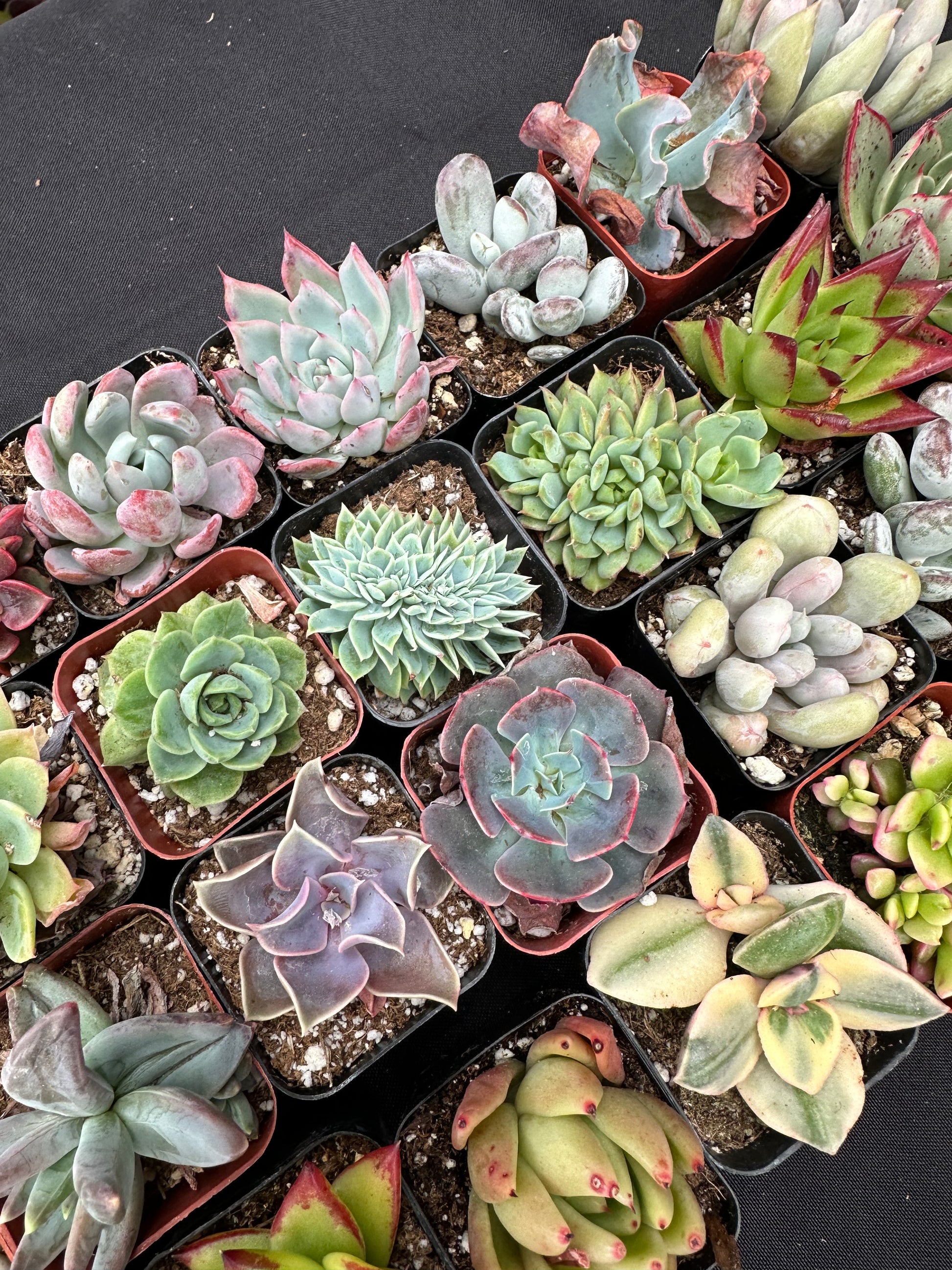 32 succulents per half flat. PURE HAPPINESS! And you get a gorgeous 4” succulent (variety based on my current inventory) for FREE with your half flat order! Pictures are an example of the color and varieties I offer